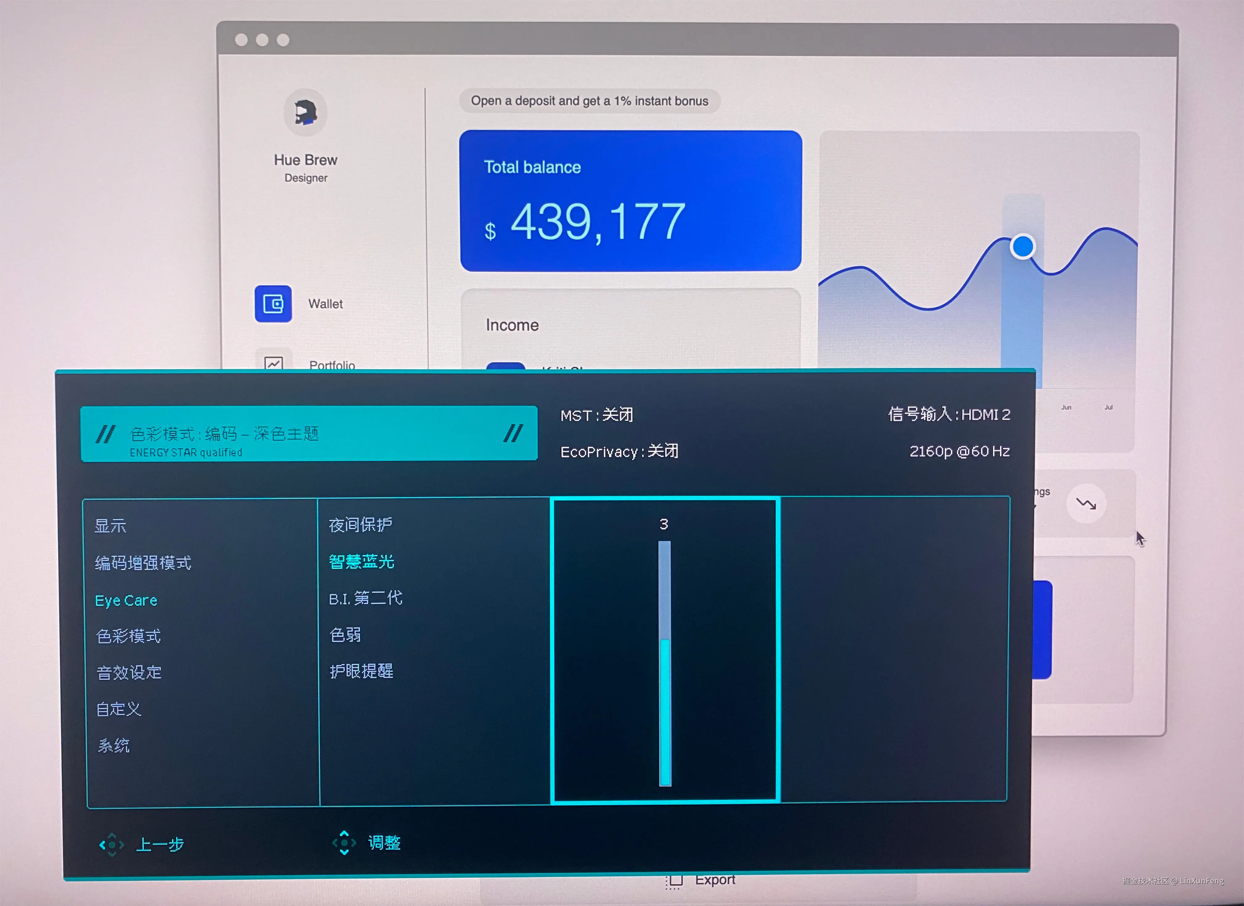 OSD 菜单中的“智慧蓝光”功能,能过滤有害蓝光,在保护视力的同时,不影响色彩准确性。双重护眼,让开发者们告别眼睛干涩、酸胀。