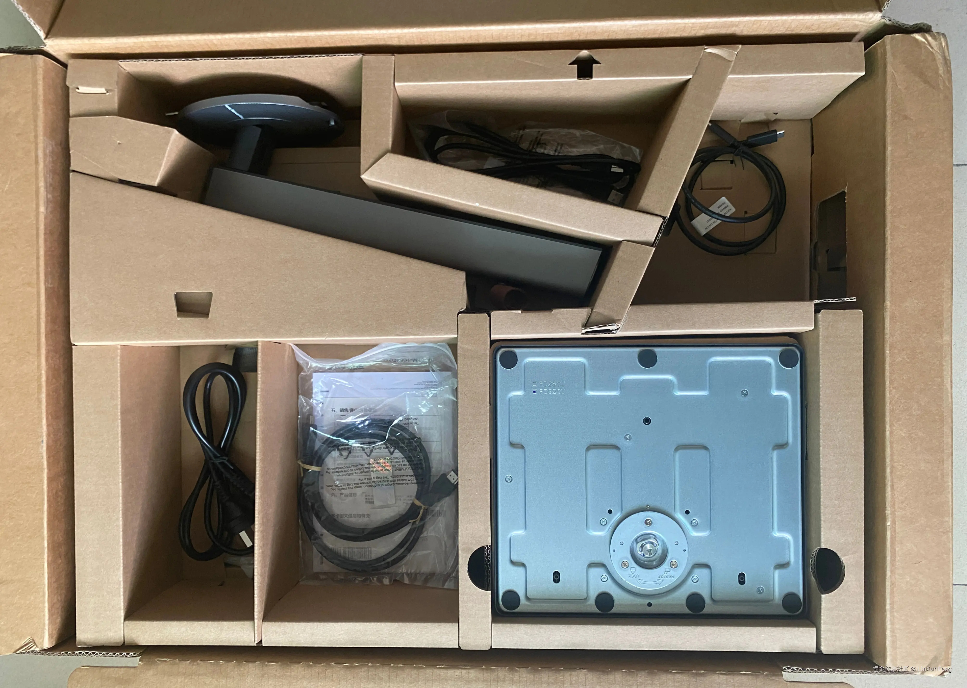 打开包装,明基显示器的所有配件便跃然眼前:电源线、Type-B 线、Type-C 线、HDMI 线,各类接口线材一应俱全,底座、可调节人体工学支架分层收纳,井然有序。