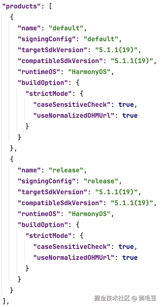 name为default的products配置项,使用的签名为default。将该配置项复制一份,将name和signingConfing均改为release,如下图所示。