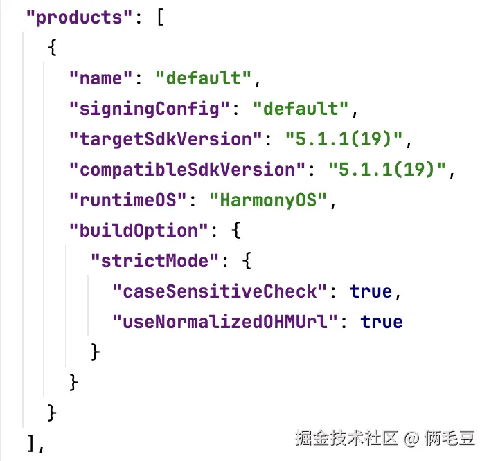 配置好证书之后,我们的目标是可以灵活的按需指定证书,编译不同版本的App包。在DevEco Studio中,可以通过不同的产品来关联不同的证书,即build-profile.json5文件中的products配置项,默认如下图所示。