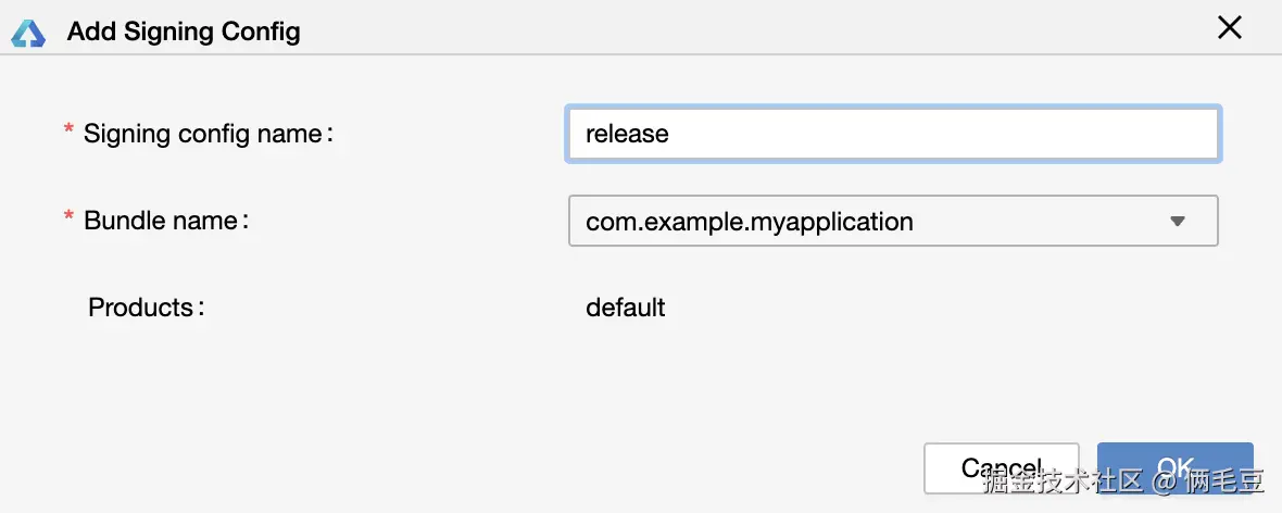 这时弹出Add Signing Config对话框,如下图,在Signing config name选项中,输入 release,之后点击OK,