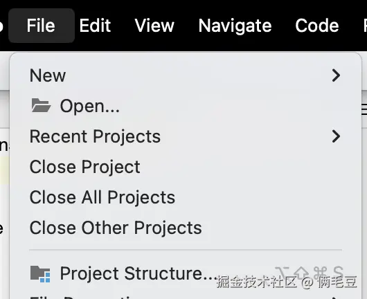 这时,如需要进行联机调试,常见的做法为,进入Project Structure,如下图,在File菜单项中,点击Project Structure。(这部分在书中有介绍,如已知晓,则忽略本小节)