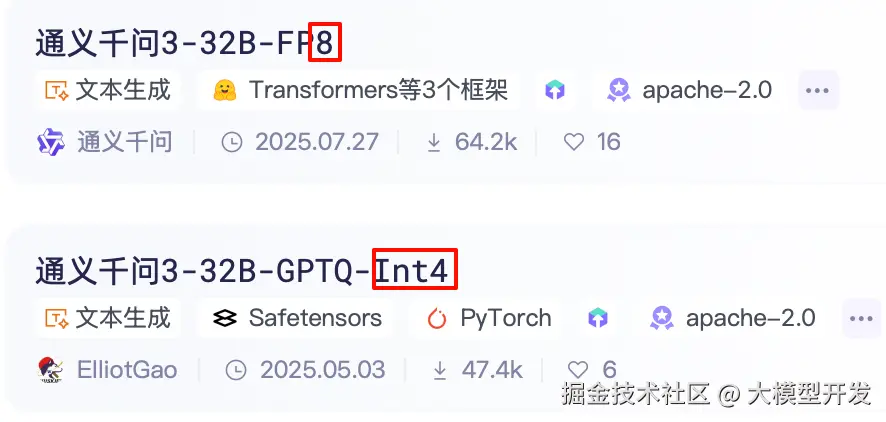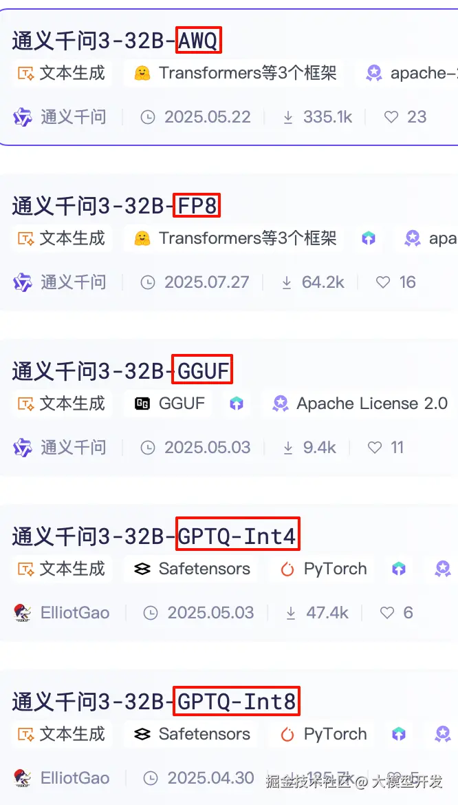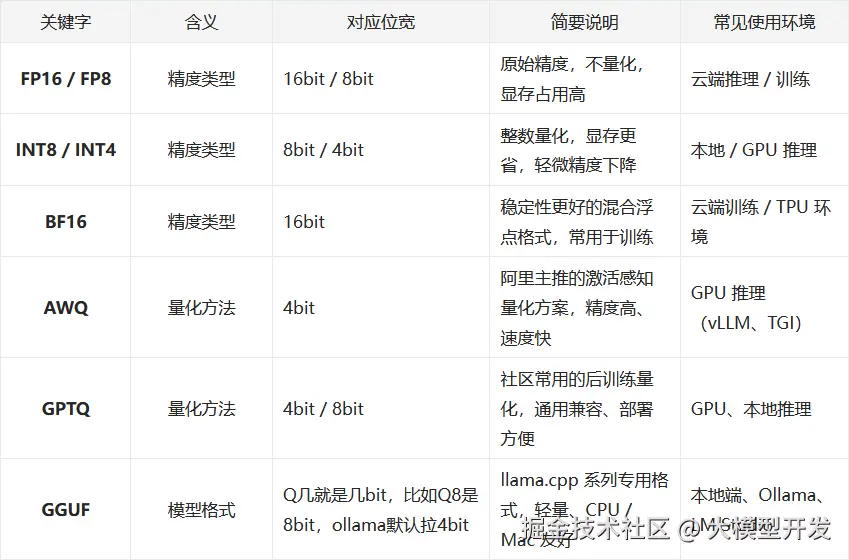 通过上图圈起来的部分,可以看到32B参数的qwen3文本对话模型的名称中包含,AWQ、FP8、GGUF、GPTQ,这些模型标识,对应的含义大家可以看下面这幅图: