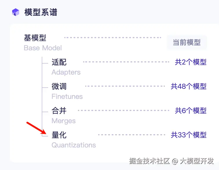 我们点进去一个通义千问3-32B的模型中,在右侧部分可以看到这个模型的系谱,其中可以找到量化这一个分类。