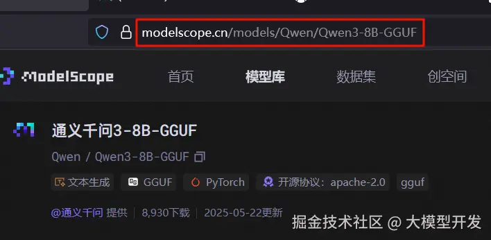 模型的安装也很简单,魔搭社区就支持ollama的命令行一键下载模型,所以我们找一个gguf格式的模型,复制这个网址。