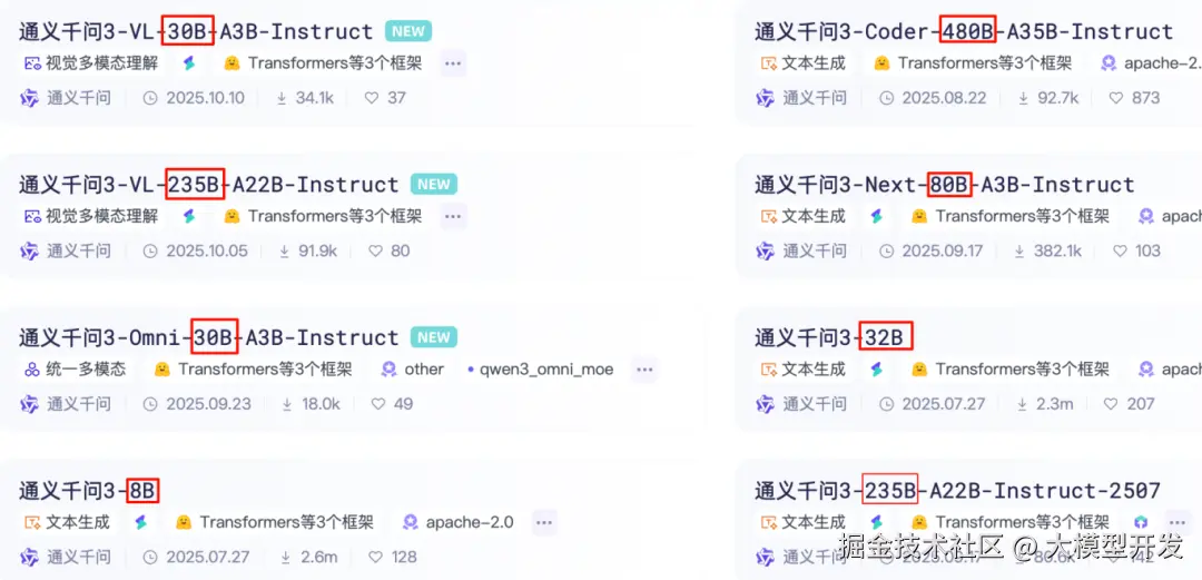 随着大模型的不断发展,小参数模型的能力也在逐渐进步,就拿阿里最新开源的qwen3来说,其中有负责多模态的qwen3-vl系列和专为代码优化的qwen3-code系列等,这些不同使用场景中都有开源的小参数模型来方便我们本地部署。