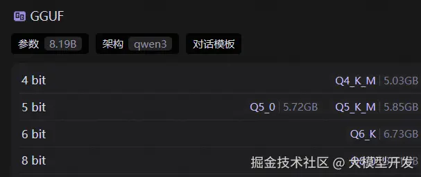 点击这个分类,可以看到当前模型的量化版本,所谓量化其实就是指的是让模型尽量不变笨的情况下,节省部署显存。比如刚刚说的235B的模型经过4bit量化后,需要的显存就从500G降为了150G左右。
