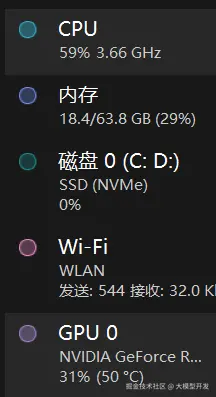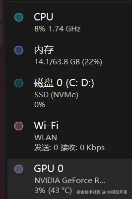 在任务管理器中可以看到没有询问模型的cpu和gpu占用情况: