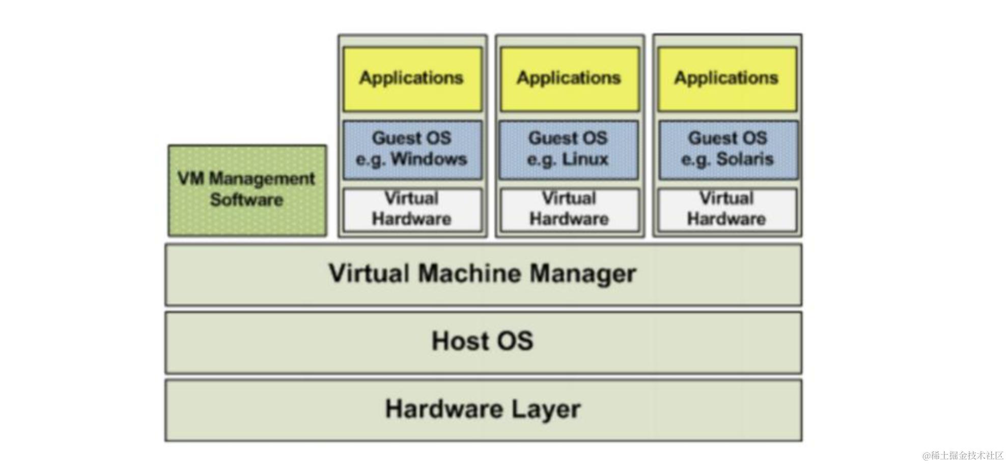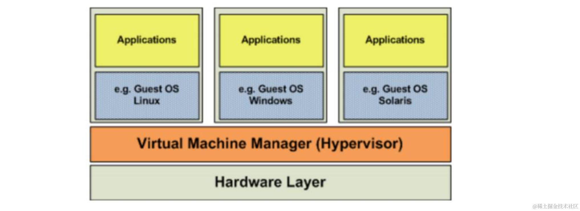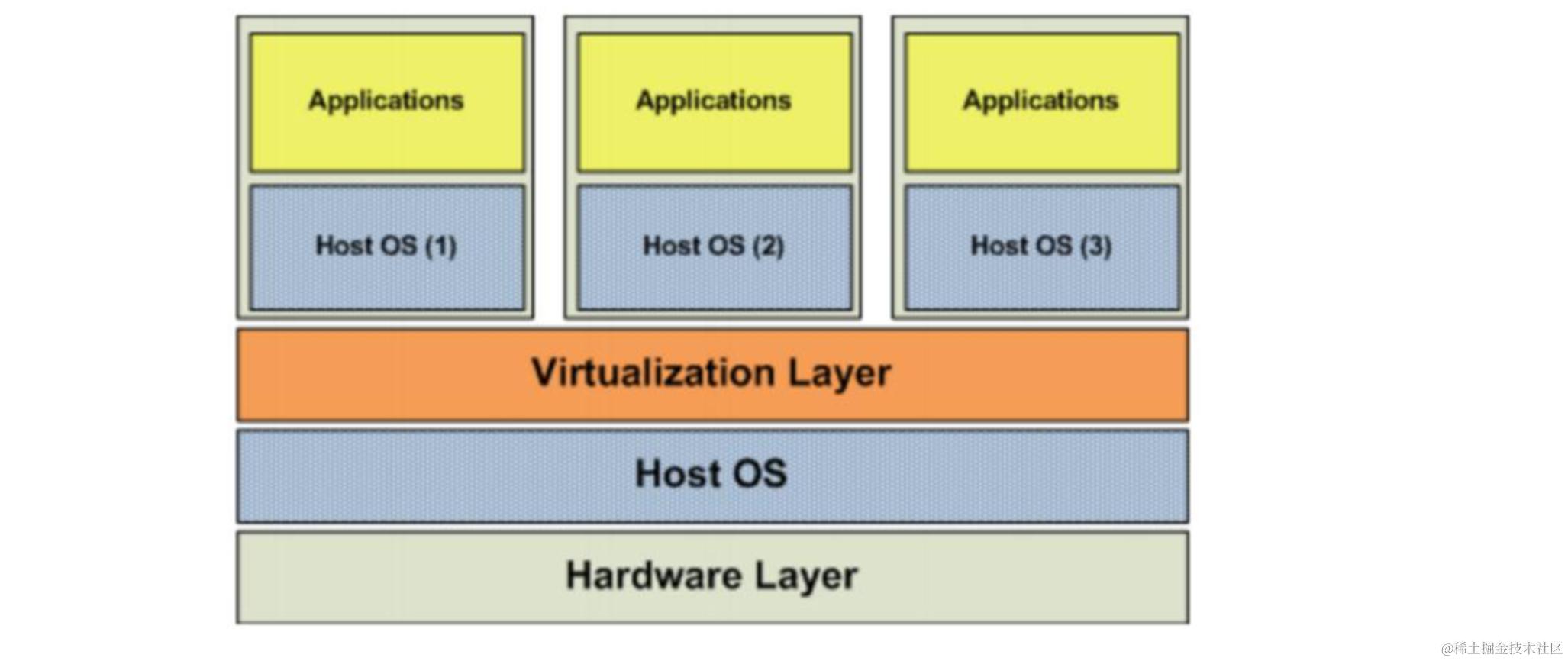 虚拟机的监视器(hypervisor)是类似于用户的应用程序运行在主机的 OS 之上,如 VMware 的 workstation,这种虚拟化产品提供了虚拟的硬件。