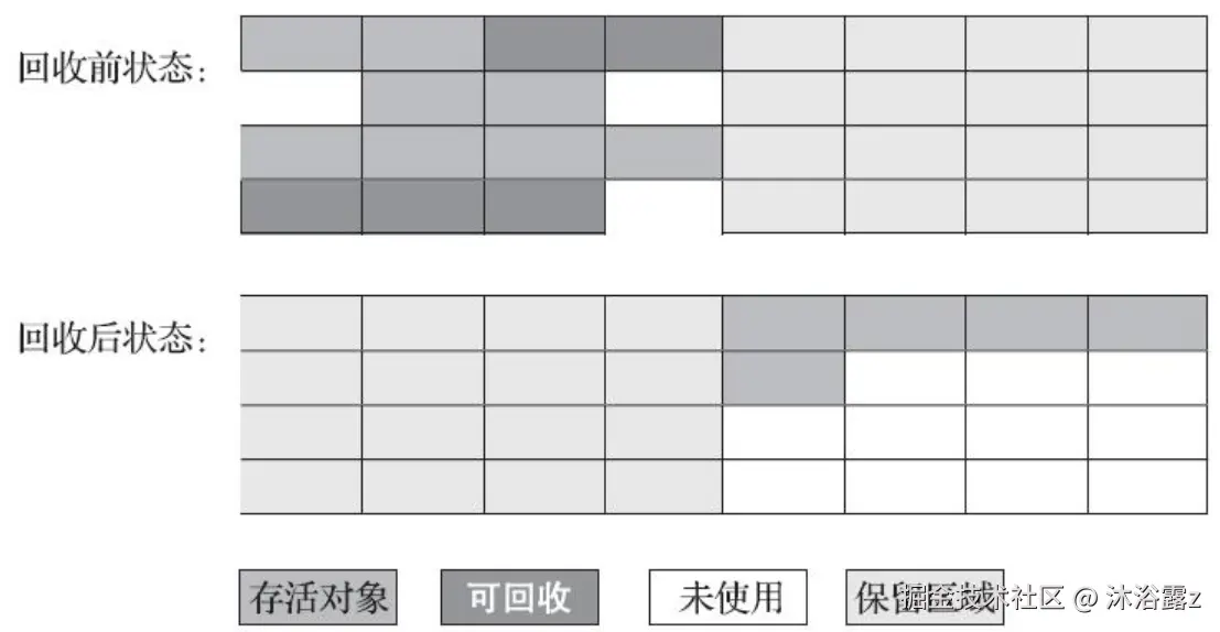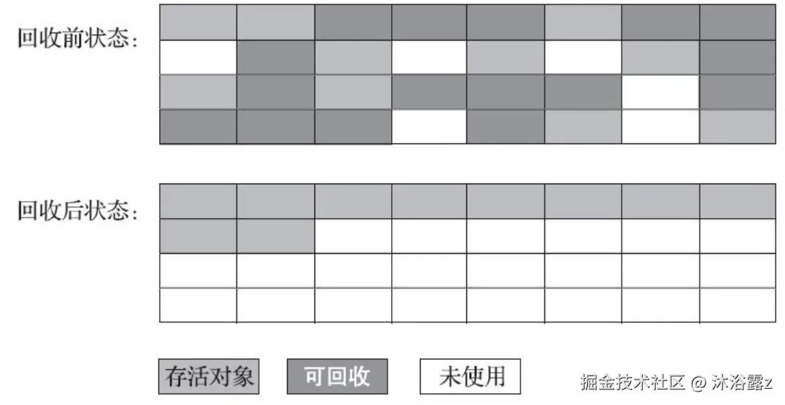 标记过程和标记-清除算法是一样的,但后续步骤不是直接对可回收对象进行清理,而是让所有存活的对象都向内存空间一端移动,然后直接清理掉边界以外的内存。两阶段操作也是STW的