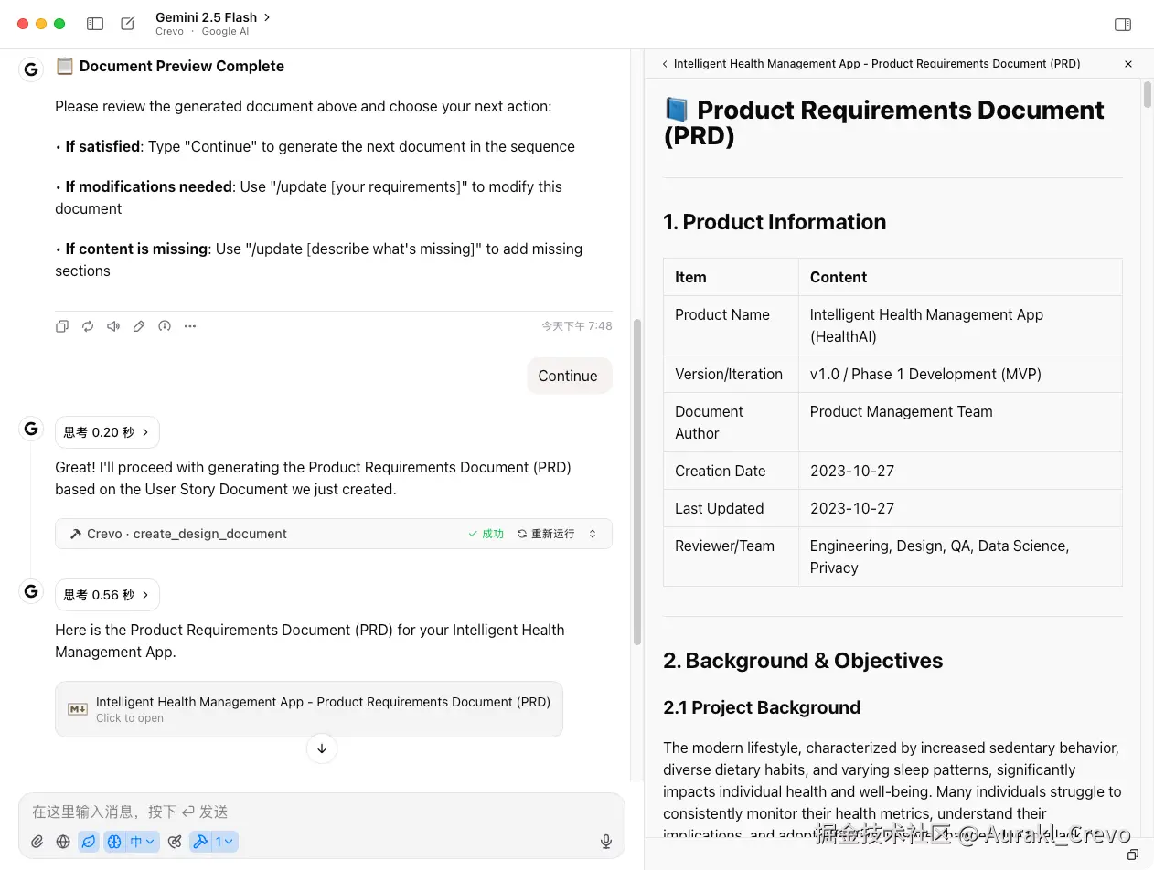 基于用户故事,Crevo 自动生成详细的 PRD: