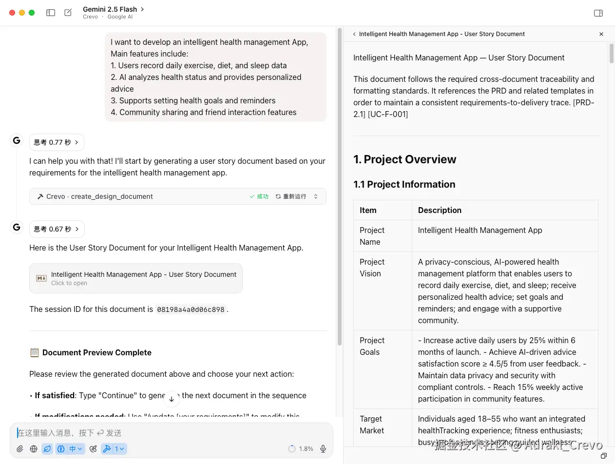 Crevo 就是这样的一个基于 AI 的软件设计文档自动生成工具,它能够根据你的产品描述,自动生成从需求到架构的完整技术方案。