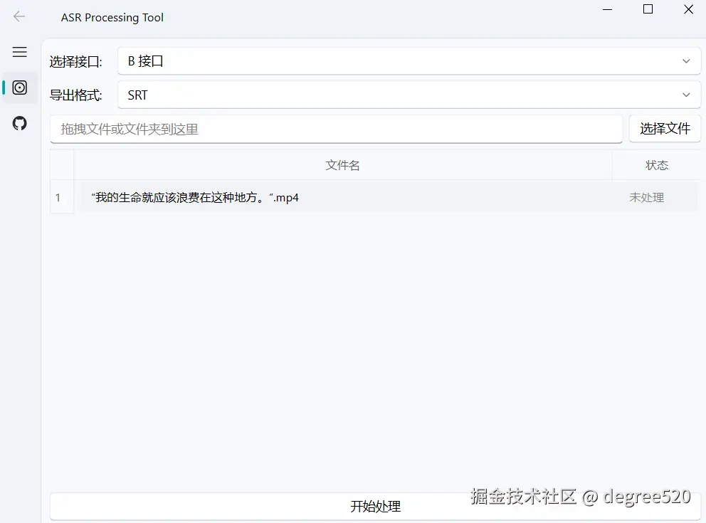 - 导入文件:将视频或音频拖入窗口,点击“开始处理”,数秒后完成语音转文字。
