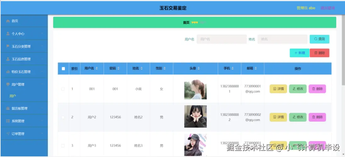 系统分为 “管理员(商家)” 和 “普通用户(消费者)” 两类角色,功能模块严格匹配玉石交易全流程: