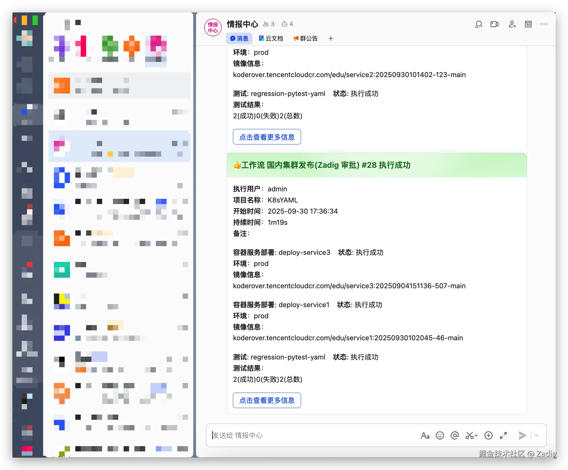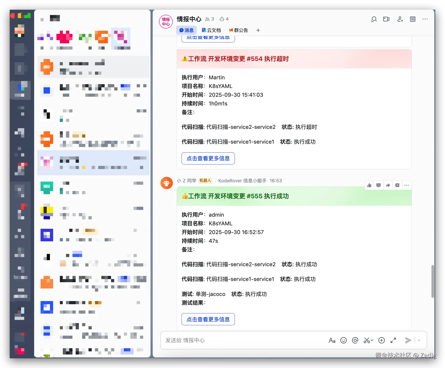 Zadig 的构建、测试、部署等交付事件,可实时生成富文本卡片并推送至飞书群聊。确保信息在协作上下文中主动流转,团队无需切换平台即可全局感知。