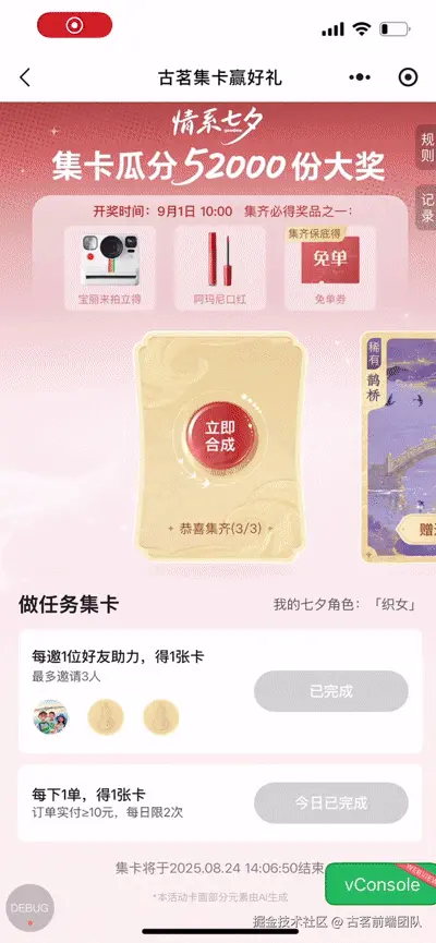 在古茗小程序的七夕集卡活动中,用户通过完成任务或好友助力收集不同类型的角色卡片,并通过合成机制解锁抽奖机会。为了增强这一关键交互节点的情绪价值与沉浸感,业务希望在“合卡”动作触发时加入更具仪式感的氛围动画效果,例如卡片旋转合并、光粒散射、浪漫特效联动等,进一步放大节日主题情绪,提升页面吸引力和互动反馈质感,从而提升用户停留时长与参与积极性。