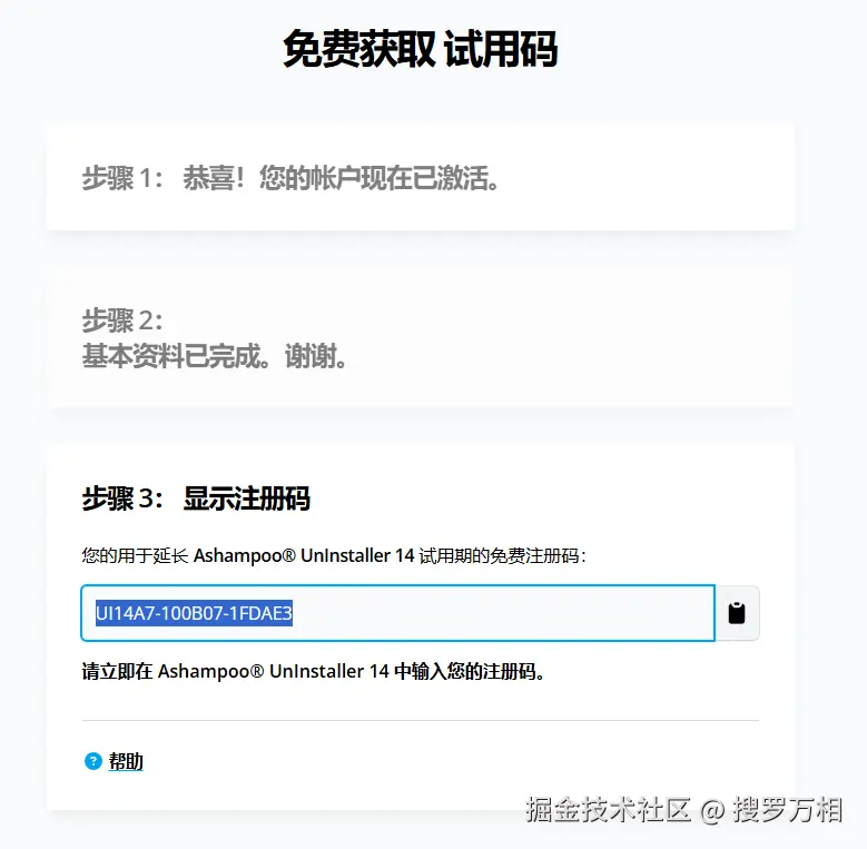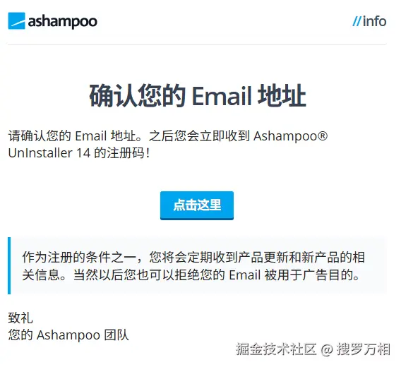2、点击确认Email 地址。之后您会立即收到 Ashampoo® UnInstaller 14 的注册码!