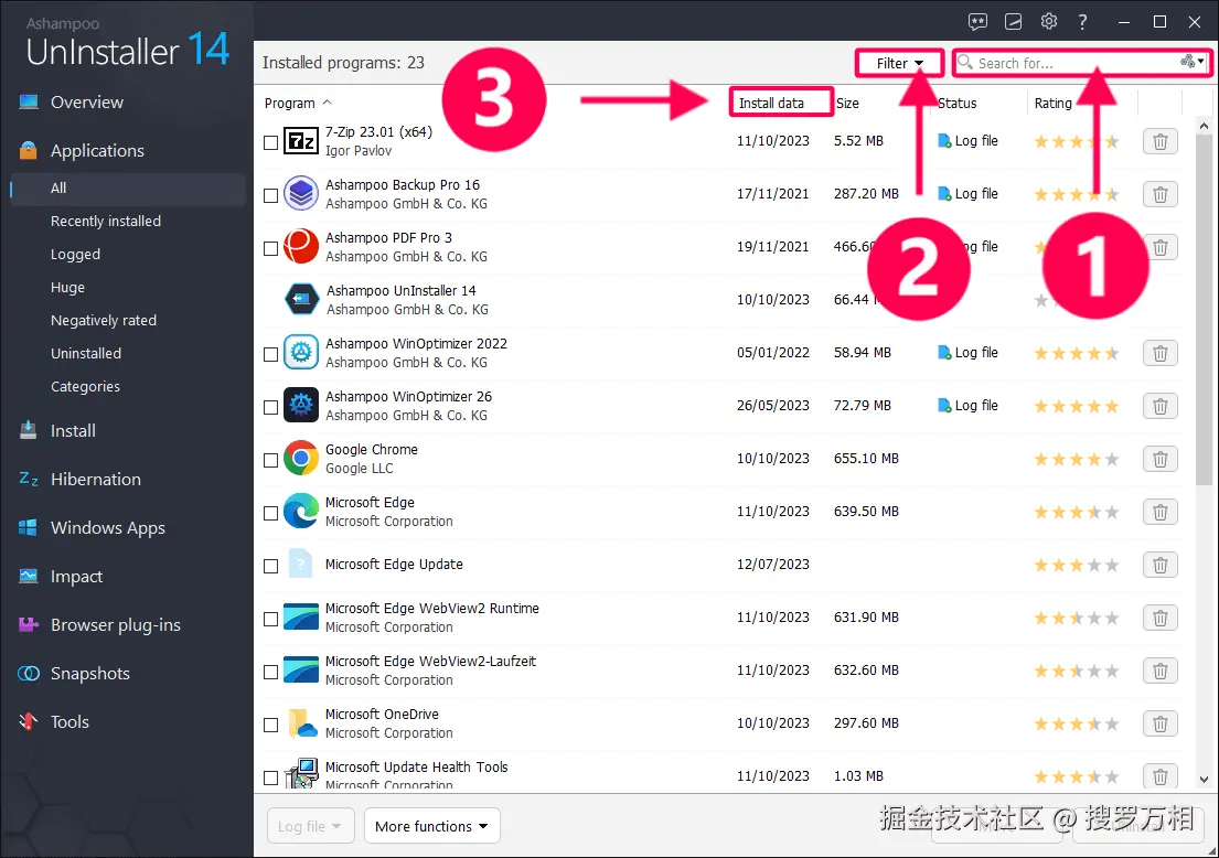 接下来,使用搜索(1)、过滤(2)或排序功能(3)找到要卸载的程序。