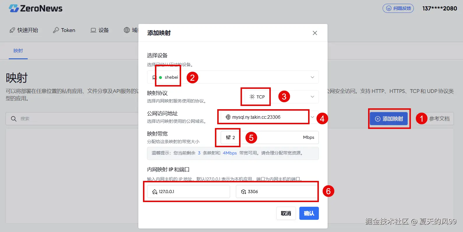 进入"映射"页面,点击 "添加映射”添加 mysql 映射 。选择设备(Agent):选择已经认证的设备(Agent)