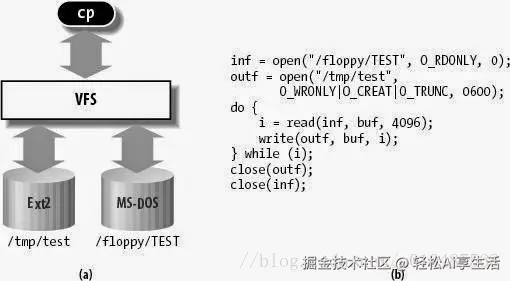 VFS为不同设备或文件系统间的访问提供了媒介,下面的示意图和代码中,用户通过cp命令进行文件的拷贝,对用户来说是不用关心底层是否跨越文件系统和设备的,具体都通过VFS抽象层实现对不同文件系统的读写操作。
