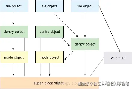 每个打开的文件对用户来说有一个文件描述符,也就是VFS抽象的file object。file object指向一个dentry,dentry指向新的dentry或一个inode,inode最终代表了一个具体存储设备上的数据。