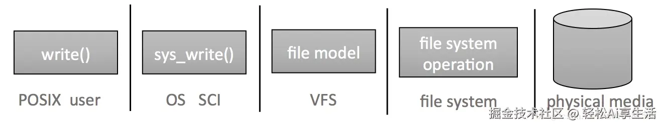 用户写入一个文件,使用 POSIX 标准的 write 接口,会被操作系统接管,转调 sys_write 这个系统调用(属于SCI层)。然后 VFS 层接受到这个调用,通过自身抽象的模型,转换为对给定文件系统、给定设备的操作,这一关键性的步骤是VFS的核心,需要有统一的模型,使得对任意支持的文件系统都能实现系统的功能。这就是VFS提供的统一的文件模型(common file model),底层具体的文件系统负责具体实现这种文件模型,负责完成POSIX API的功能,并最终实现对物理存储设备的操作。