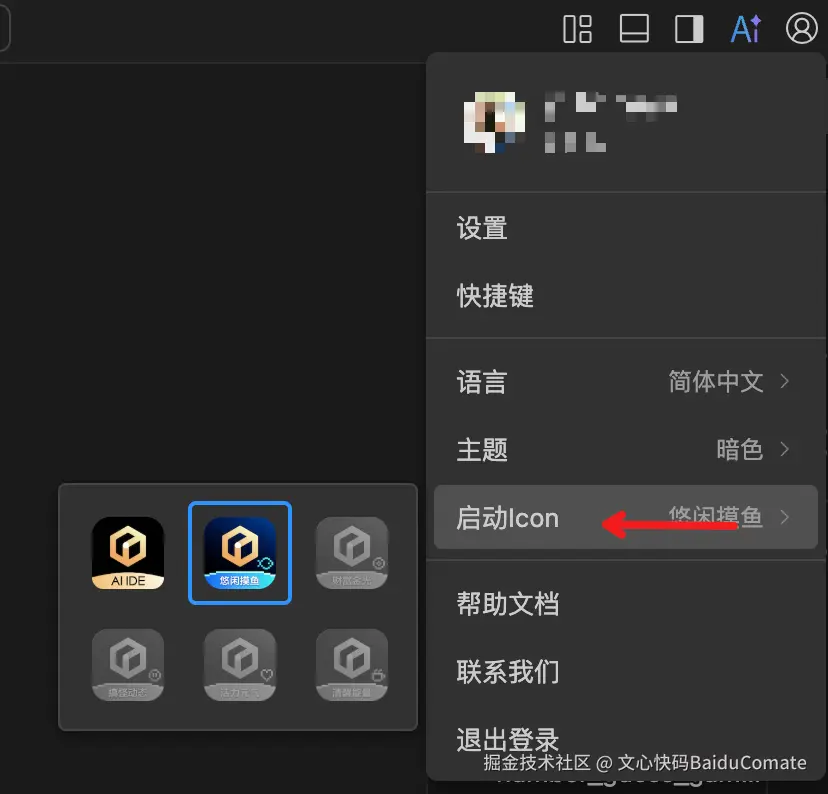 当获得启动图标后,点击Comate AI IDE右上角「个人」👉🏻 「启动icon」 👉🏻 选择列表中的其他icon。