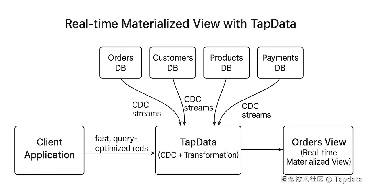 TapData 在这种理念的基础上再进一步:不依赖单一数据库的存储结构,而是在跨源的实时数据管道中完成采集、合并和重组,把原本需要在查询时临时拼接的数据,预先整理成一个随时可查的增量物化视图。无论数据来自关系型数据库、文档数据库还是消息系统,都可以通过这一机制在下游以低延迟获得完整视图。