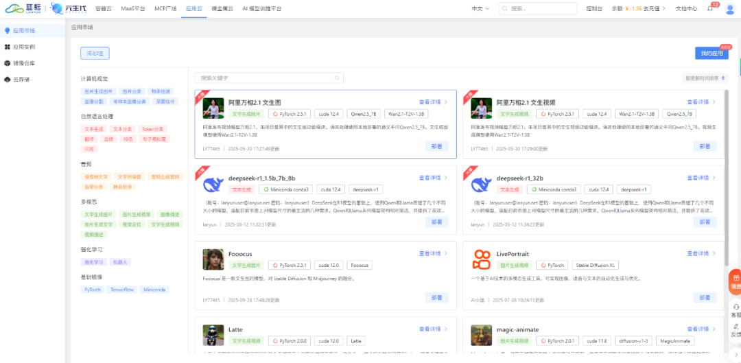 - 聚焦“镜像到服务”转化环节,通过模板化创建、一键启动,快速部署,解决“应用上线周期长、发布风险高”的难题。同时,应用实例支持SSH操作、资源灵活调整、监控告警及共享网盘功能,实现轻量化运维,降低管理成本。