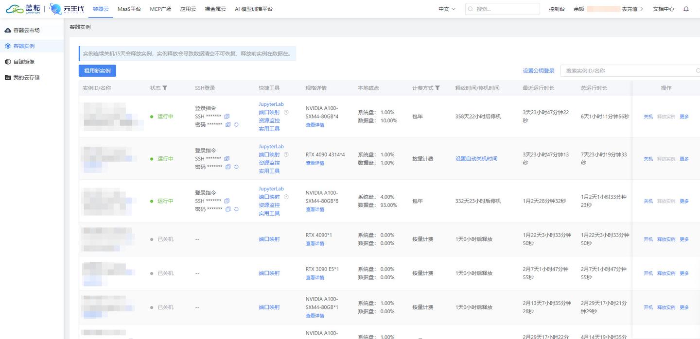 - 实例全生命周期管理:覆盖“创建-使用-回收” 全流程,通过SSH/JupyterLab远程操作、一键开关机、资源监控、弹性扩缩容等功能,解决“运维复杂度高、资源利用率低”的问题,实现实例高效管控与资源按需分配。