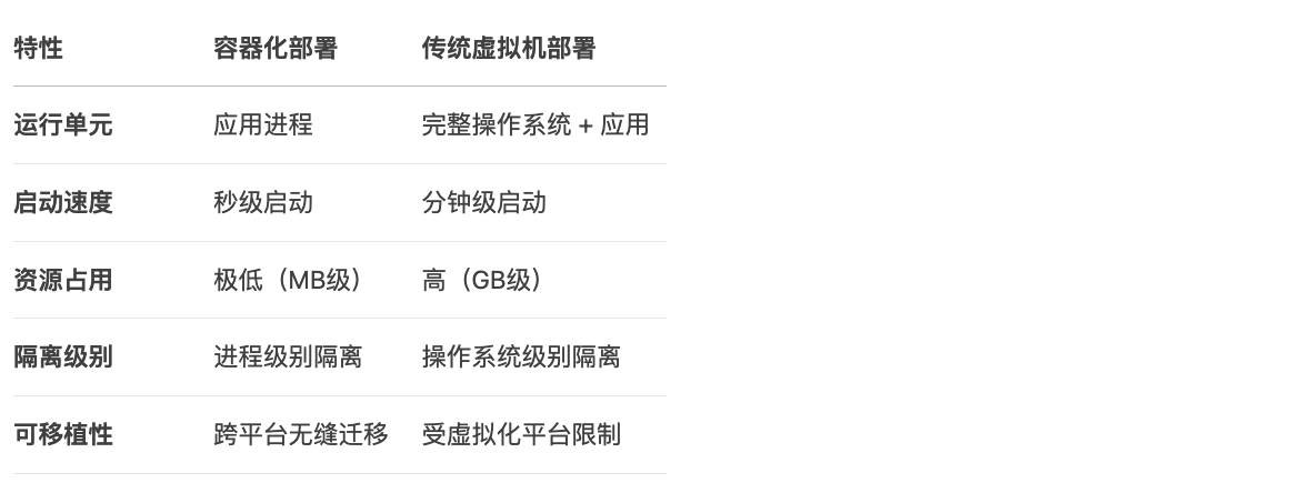 与传统虚拟机相比,容器具有革命性的轻量化优势。它不包含完整的操作系统,而是共享宿主机的操作系统内核,仅通过隔离进程和文件系统实现应用沙盒化 。这种架构带来三大核心优势: