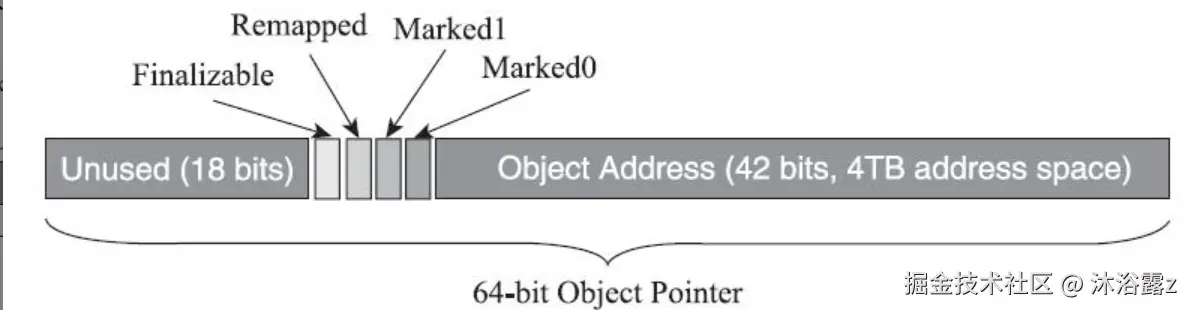 ZGC使用染色指针把标记信息记在引用对象的指针上,通过这些标志信息,虚拟机可以直接从指针中看到其引用对象的三色标记状态、是否进入了重分配集(即被移动过)、是否只能通过finalize()方法才能被访问到。