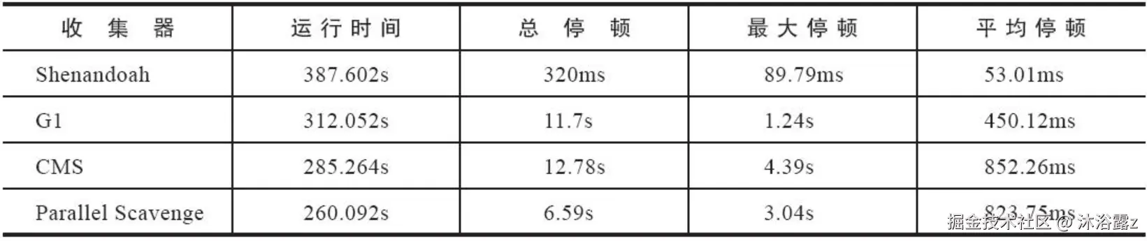 停顿时间比其他几款收集器确实有了质的飞跃,但也并未实现最大停顿时间控制在十毫秒以内的目标,而吞吐量方面则出现了很明显的下降,其总运行时间是所有测试收集器中最长的。