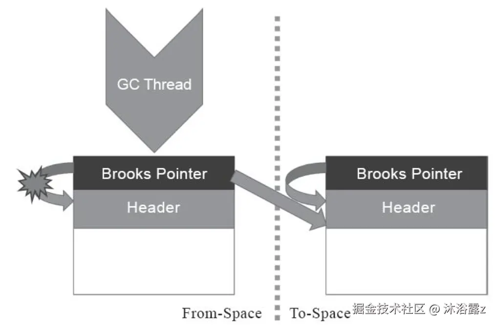 在原有对象布局结构的最前面统一增加一个新的引用字段,在正常不处于并发移动的情况下,该引用指向对象自己。当对象复制到新的Region的时候,这个指针就指向新的Region中的对象,使对该对象的访问转移到新副本上。 并且旧对象依然存在,只要没有被清理依然可以使用。