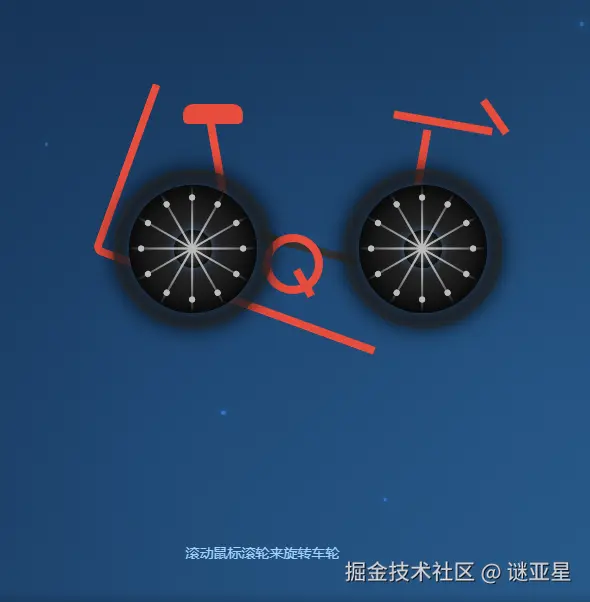 第一次是画一个自行车,鼠标滚轮滚动时车轮可以转动。大家都不会画自行车,不过deepseek实现的比较好,车轮是可以转的