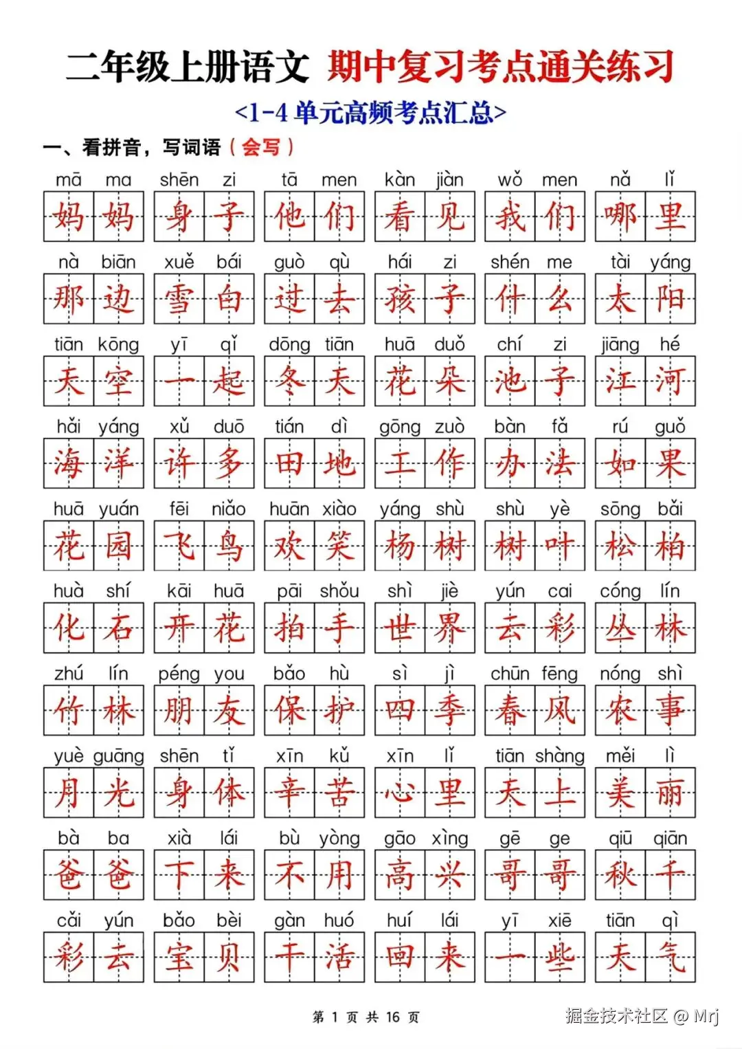 25年人教新版二年级上册语文期中复习《单元考点通关练习》,有答案共16页,电子版可下载,这份二年级语文期中练习题,包含了1—4单元中的看拼音写词语、易错读音、组词、近反义词、词语搭配、课文回顾等高频考点,帮助孩子及时查漏补缺,助力期中考试取得优异成绩。需要的家长抓紧领取上,给孩子练一练吧。
