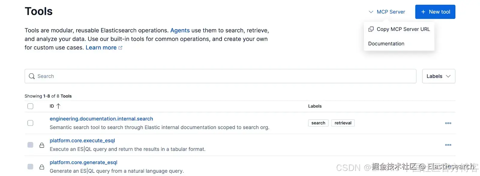 Elastic Agent Builder 会自动通过安全的 MCP 端点暴露所有可用工具。你可以在 Kibana 的 Tools UI 中找到你的专属服务器 URL。