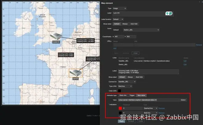 3、拓扑图链接现在支持基于监控项值阈值的链接指示器,允许在监控项值超过阈值时动态更改拓扑图链接样式和颜色