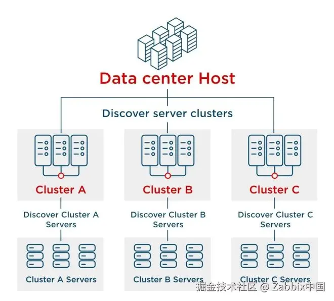 2、嵌套主机原型在发现多层级实体时非常有用,例如:发现服务器集群,其中每个集群包含一组需要发现的独立节点