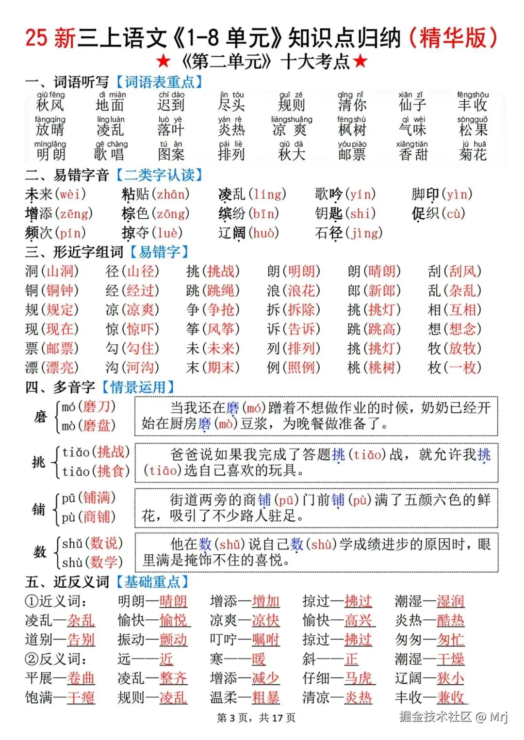 25年人教新版三年级上册语文期中复习《单元考点通关练习》,有答案共18页,电子版可下载,这份三年级语文期中练习题,包含了1—4单元中的看拼音写词语、生字注音、组词、近反义词、课文回顾、必背内容等高频考点,帮助孩子巩固所学知识,助力期中考试取得优异成绩。需要的家长抓紧领取上,让孩子练一练吧。