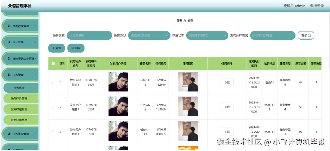 - 任务发布:发布用户登录系统,填写任务需求、悬赏金额、执行要求等信息并提交审核