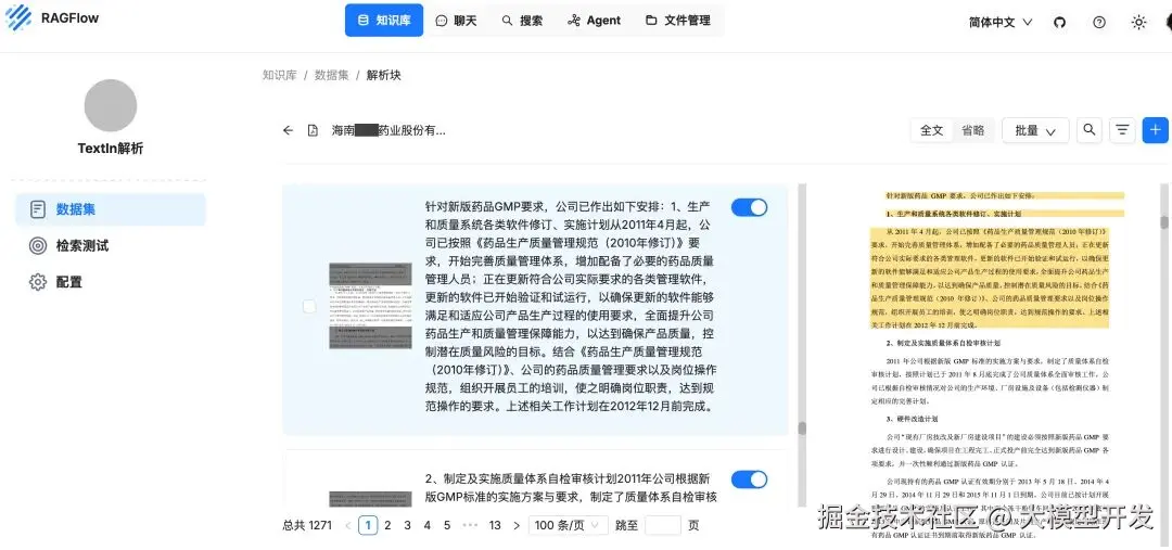 这种方法最大的好处在于简便快捷,但由于RAGFlow的API导入有一定缺陷,会产生上传信息不完整(如缺少图片、位置信息)、分块顺序紊乱等问题,因而在知识库预览时也无法联动PDF源文件位置,快速进行对应查看和校对。