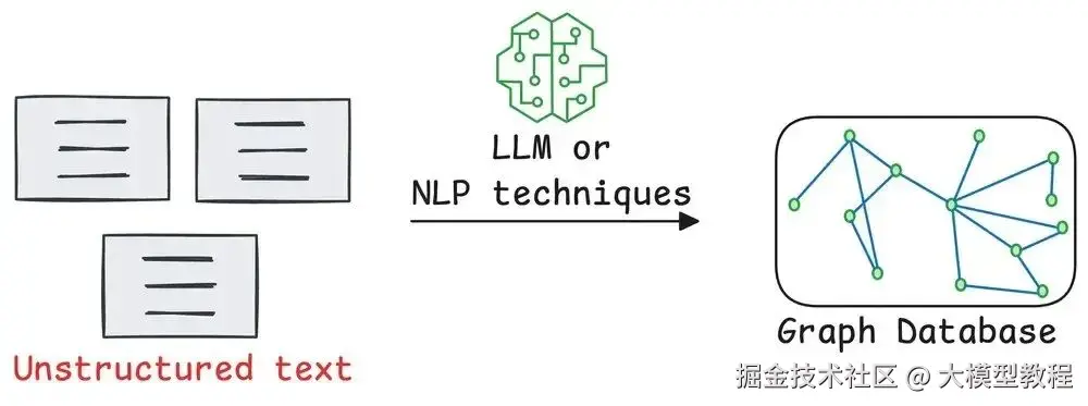 收集实体和它们的关系 Graph RAG 的关键步骤是从文档里建一个 graph。通常用一个 LLM(大型语言模型)读文本,找出重要的东西,比如人、地点或成就,然后标注它们怎么关联。
