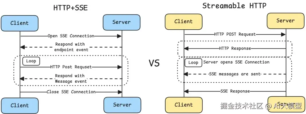 - Streamable HTTP 允许服务器在需要时将响应升级为 SSE 流,实现流式传输,同时保留标准 HTTP 通信能力,满足了“既是传统 API 又能流式推送”的混合需求