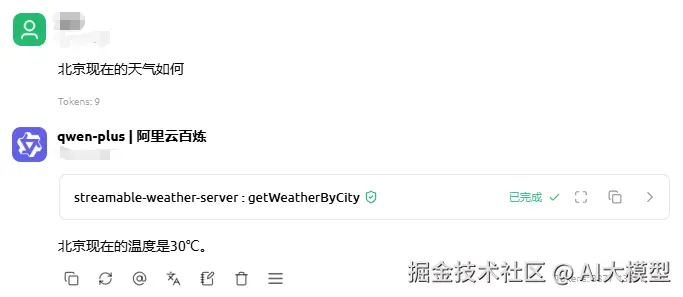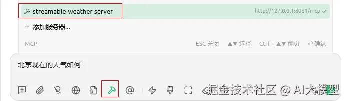 public String getWeatherByCity(@ToolParam(description = "城市名称") String cityName) {