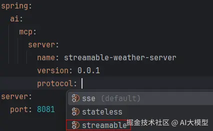 在IDEA 工具中输入 protocol 的时候,发现已经可以支持 streamable 了,Spring AI 1.0.0 版本是没有这个选项的