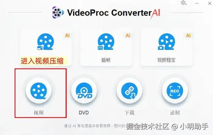 VideoProc Converter将视频压缩的主要操作步骤为: 打开软件后,点击视频模块,上传视频——选择压缩功能,调整视频压缩率——导出压缩后的视频至本地。