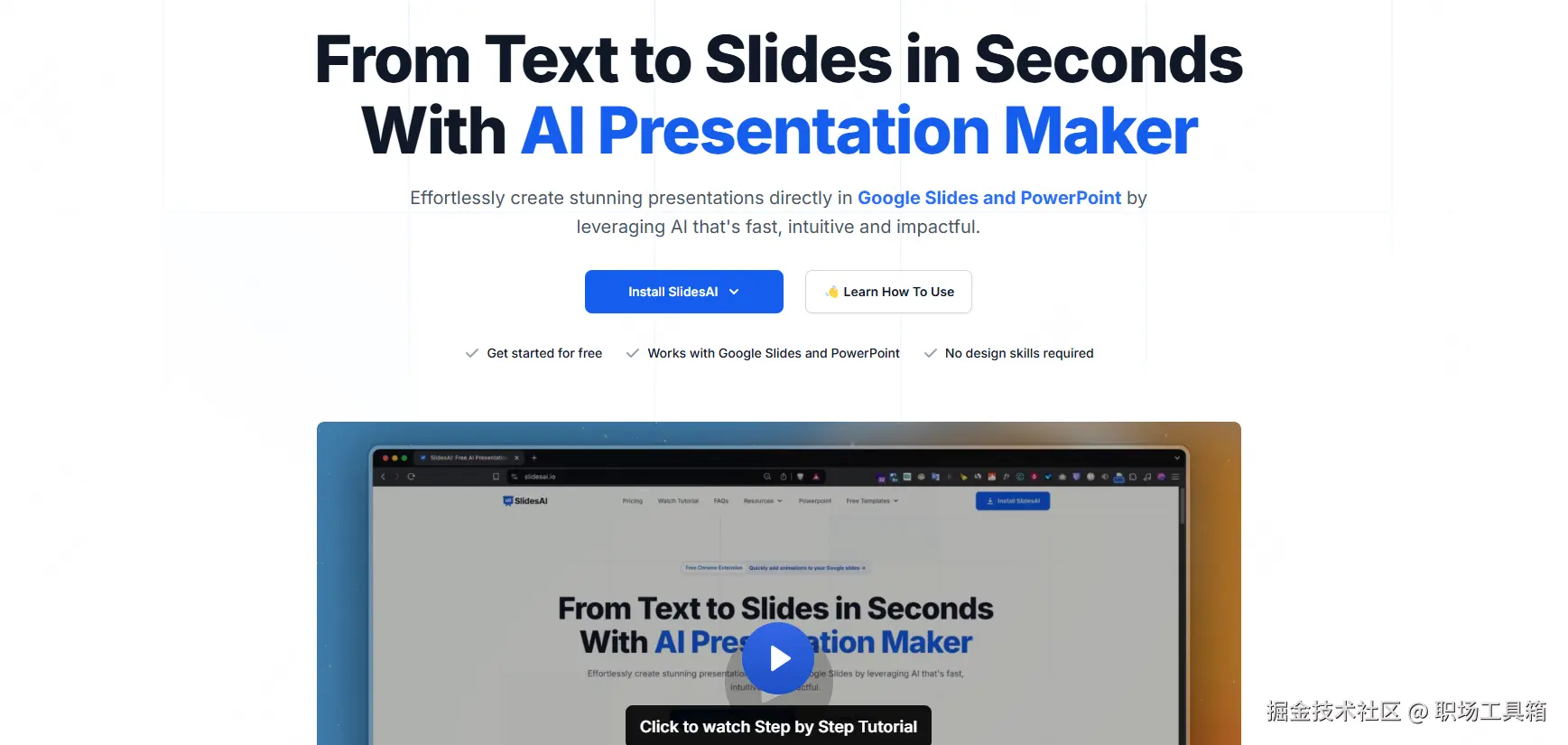SlidesAI的定位非常明确,它是一款专为Google Slides(谷歌幻灯片)和Microsoft PowerPoint用户设计的AI插件。它并没有试图去创造一个新的平台,而是选择将AI能力无缝地集成到用户最熟悉的工作环境中。对于亿万的Google Slides和PowerPoint用户来说,这意味着他们几乎不需要任何学习成本,就能在自己惯用的软件中,享受到AI带来的便利。