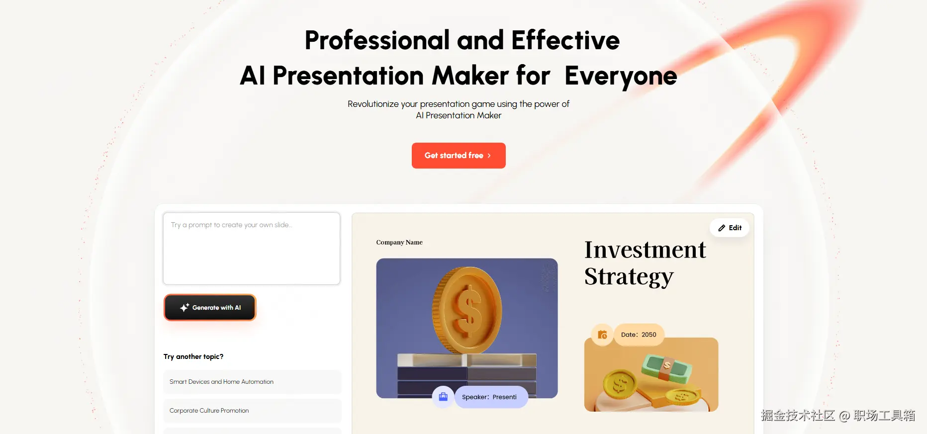 自动化设计与智能布局:Presenti内置了一个智能设计系统。在你生成PPT后,AI会自动为你优化布局、匹配和谐的色彩方案,并调整字体排版,确保每一页幻灯片都看起来专业且美观。它的“智能布局”功能能够根据内容量的变化,自动调整元素的位置和大小,避免了手动排版的繁琐。