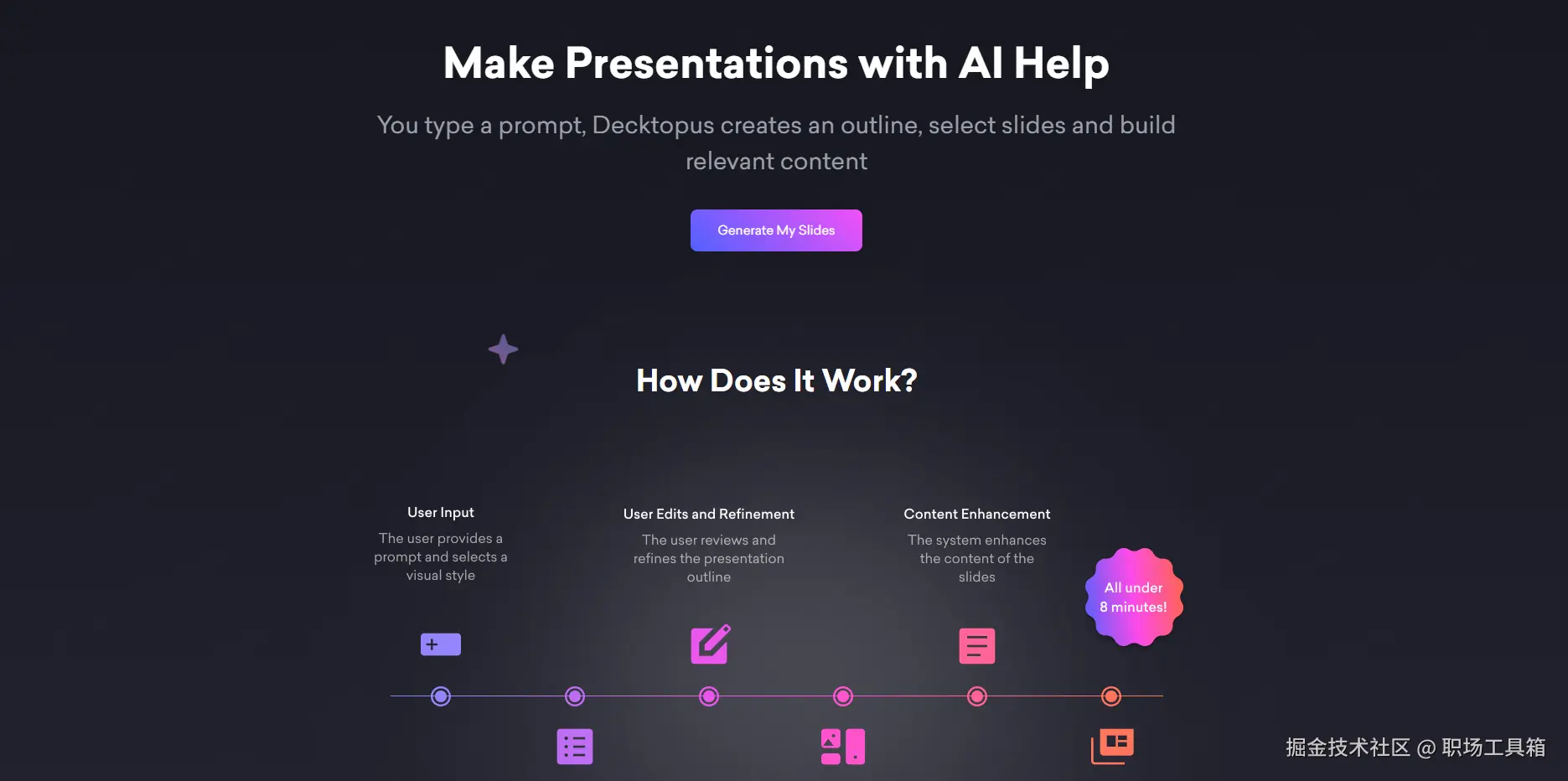 这些看似简单的提问,实际上帮助Decktopus AI更精准地把握你的真实需求。有了这些信息作为基础,生成出来的演示文稿往往能直击要害,而不是泛泛而谈。